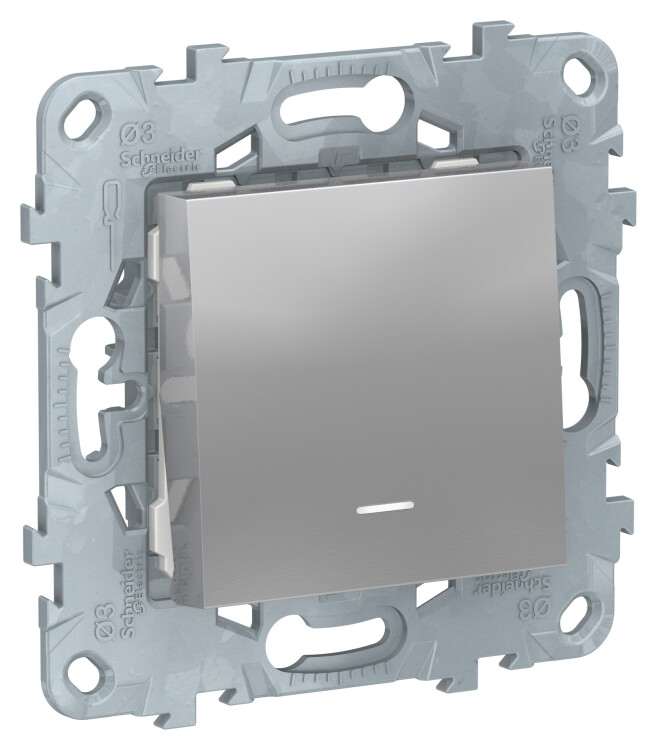 Выключатель одноклавишный Schneider Electric UNICA NEW (алюминий) кнопочный с подсветкой предназначен для сетей до 250 В на ток до 10 А.
