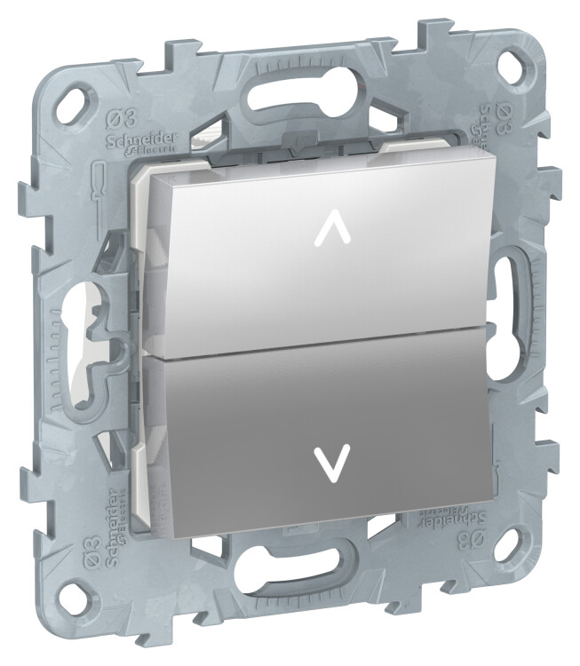 Выключатель двухклавишный для жалюзи Schneider Electric UNICA NEW (алюминий) без подсветки и без фиксации предназначен для сетей до 250 В на ток до 10 А.