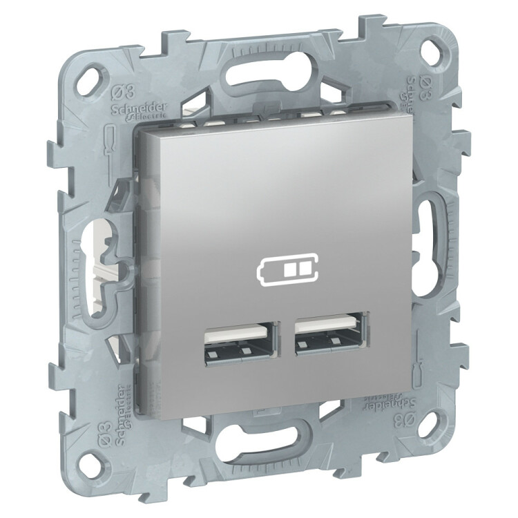 Розетка USB зарядная Schneider Electric UNICA NEW (алюминий) с двумя разъёмами предназначена для сетей до 5 В постоянного тока и максимальный ток нагрузки 2,1 А.