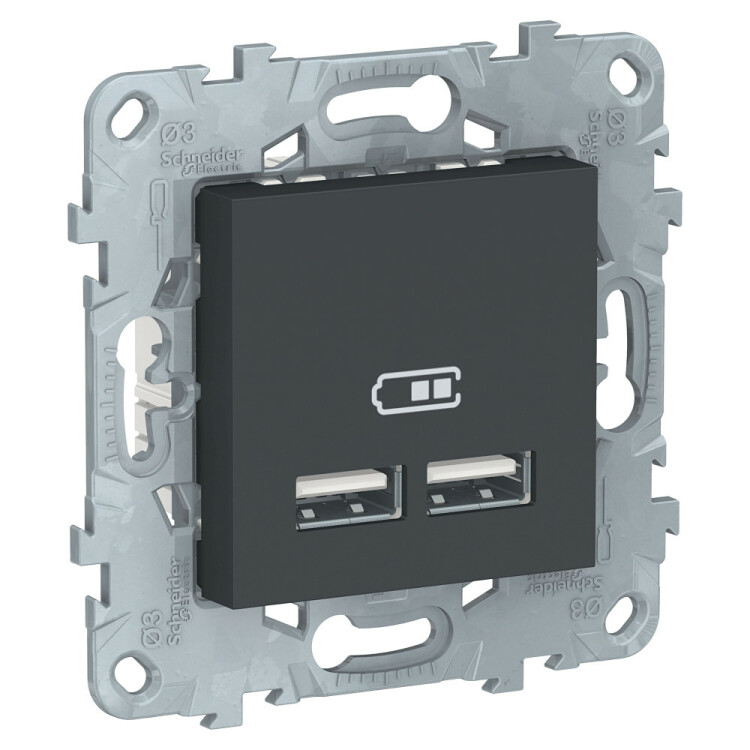 Розетка USB зарядная Schneider Electric UNICA NEW (антрацит) с двумя разъёмами предназначена для сетей до 5 В постоянного тока и максимальный ток нагрузки 2,1 А.