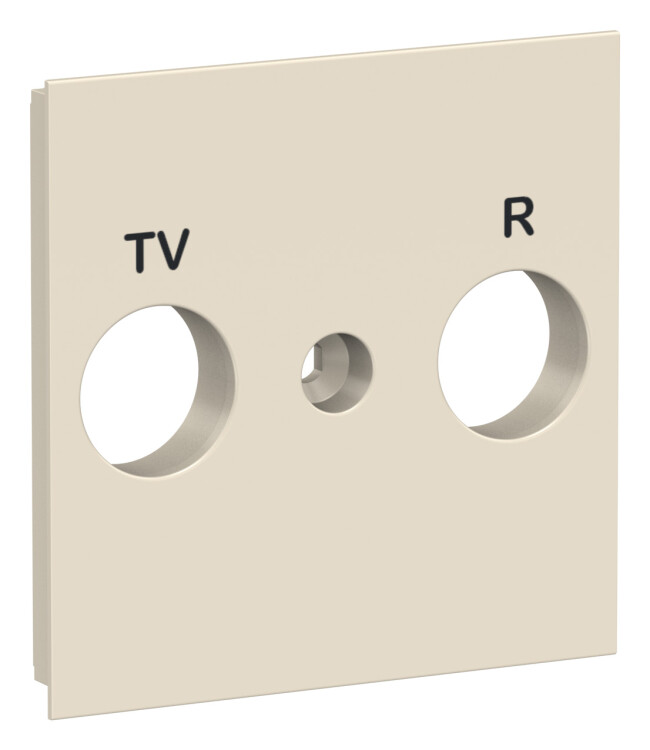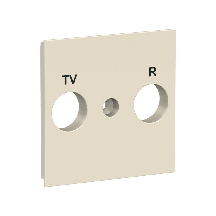 Лицевая панель розетки TV/FM Schneider Electric UNICA NEW (бежевый) с подписями разъёмов.