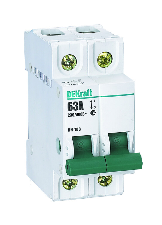 Выключатель-разъединитель серии ВН-103 DEKraft; 2P; номинальный ток 125 А; ширина and ndash; 2 мод. х 18 мм; установка and ndash; на DIN-рейку; установочное положение - любое. Выключатели-разъединители применяются для ручного включения/отключения сетей напряжением до 400 В. Специальные мостиковые контакты обеспечивают надежный разрыв цепи; они полностью исключают возможность перекрытия дугой по изоляции. Усиленная рукоятка управления обеспечивает большое количество включений/отключений.