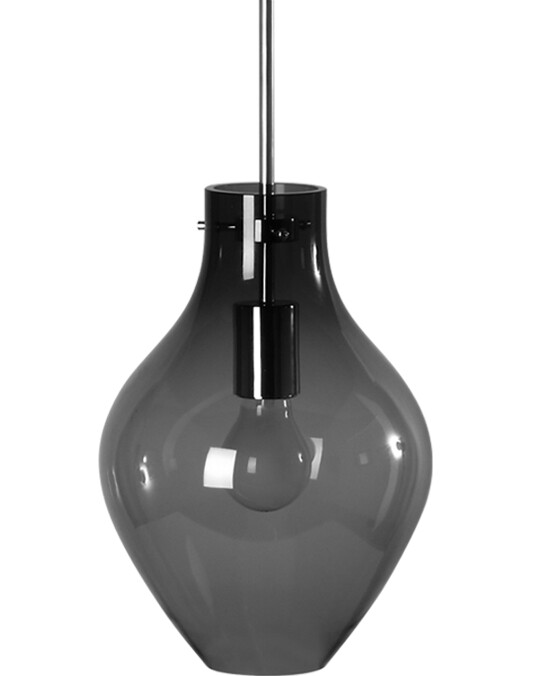 Подвесной светильник с прозрачным рассеивателем из выдувного дымчатого стекла ручной работы. Потолочная чашка и монтажная плата из хромированного металла CH. Возможные цвета: BR латунь (металлические части) и стекло цвета amber, WH белый (металлические части) и трехслойное опаловое белое стекло.