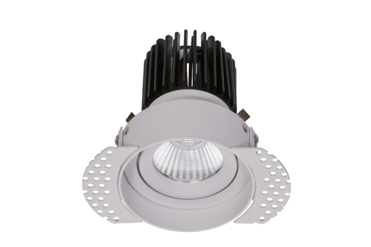 Встраиваемый светильник направленного света. Корпус светильника изготовлен из алюминия, декоративная рамка из окрашенного белой матовой краской алюминия. Поворотная оптическая часть закрыта защитным стеклом. Установка в ниши в потолках из гипсокартонных плит с помощью монтажных клипс.