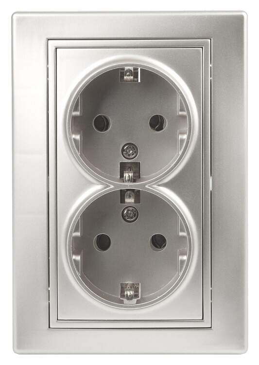 Розетка двойная 2-я серии Intro Plano скрытой установки цвет алюминий 1-205-03. Номинальные характеристики 16А 250В. Розетка выполнена из керамики, укомплектована одноместной рамкой, оснащена винтовыми клеммами. Клеммы с двумя отверстиями позволяют соединять соседние розетки шлейфом. Установка в подрозетник производится как на монтажные лапки, так и на винты.