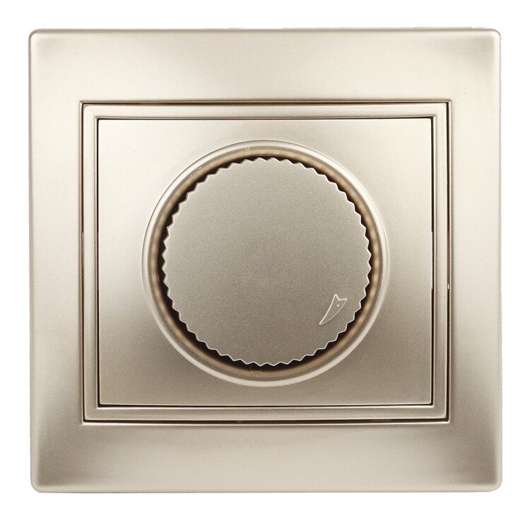 Диммер поворотный серии Intro Plano скрытой установки цвет шампань 1-401-04. Номинальные характеристики 600Вт, 230В . Диммер выполнен из негорючего термопласта, укомплектована одноместной рамкой. Для установки 2-х и более устройств в несколько подрозетников в ряд дополнительно используются многоместные рамки: 2-х постовая - 1-502-хх, 3-х постовая 1-503-хх, 4-х постовая - 1-504-хх (где хх - цветовой код: 01 - белый, 02 - слоновая кость, 03 - алюминий, 04 - шампань, 05 - антрацит, 10 - венге, 11 - сосна). Другие устройства серии вы можете найти введя в поиск Intro Plano.