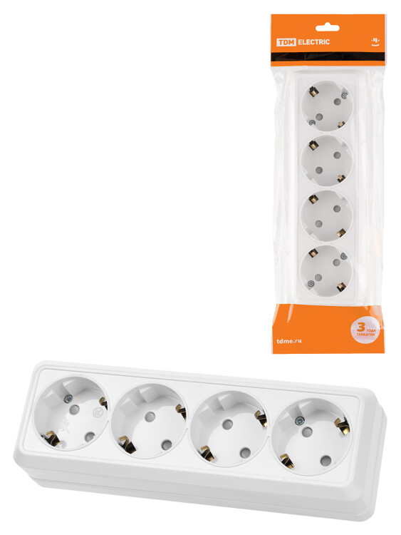 Розетка 4-х местная горизонтальная 2П+3 открытой установки IP20 16A с з/ш белая "Ладога" TDM (кр.6шт)