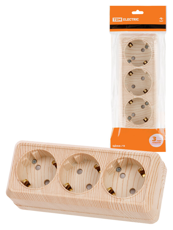 Розетка 3-х местная горизонтальная 2П+3 открытой установки IP20 16A с з/ш сосна "Ладога" TDM (кр.6шт)