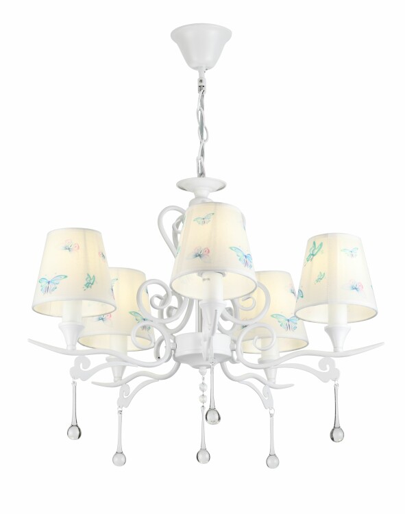 Rivoli Barbara - нежная классическая люстра в детскую или люстра в гостиную с регулировкой высоты. Диаметр люстры - 610 мм, плафоны из качественной, устойчивой к пыли абажурной ткани белого цвета. Люстры украшены декоративными подвесками из хрусталя. Корпус люстры гальванизирован в базовый белый цвет, универсальный для большинства интерьеров. Тканевые плафоны-абажуры украшает аккуратный ненавязчивый рисунок в виде бабочек голубого и розового цветов. Люстра Barbara подойдет для детской комнаты мальчика или для детской комнаты девочки. Люстра на высокий или средний потолок Barbara хороша и для классического стиля.