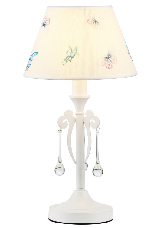 Rivoli Barbara (арт. 8001-601) - нежная настольная лампа для детской комнаты, спальни, гостиной. Корпус изготовлен из прочного металла базового белого цвета, абажур из прочной светлой ткани с льняной фактурой. Настольная лампа Barbara украшена прозрачными подвесками-каплями. Разноцветные бабочки на абажуре изюминка, за которую стоит купить этот красивый настольный светильник.