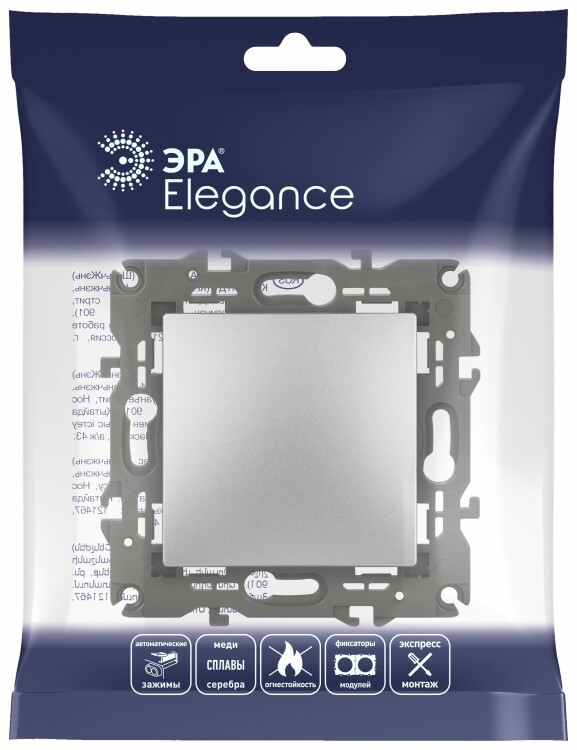 Выключатель 1-клавишный Эра Elegance алюминий 14-1101-03. Оснащён автоматическими клеммами для надёжной фиксации жил кабеля в механизме. Рамки приобретаются отдельно.
