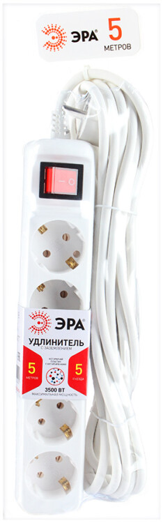 Удлинитель ЭРА серии U с заземлением: провод 3x1мм2, 100% медь, корпус - полипропилен с антипиренами (негорючий), контактные группы - латунь, максимальная нагрузка - 16A/3500Вт.