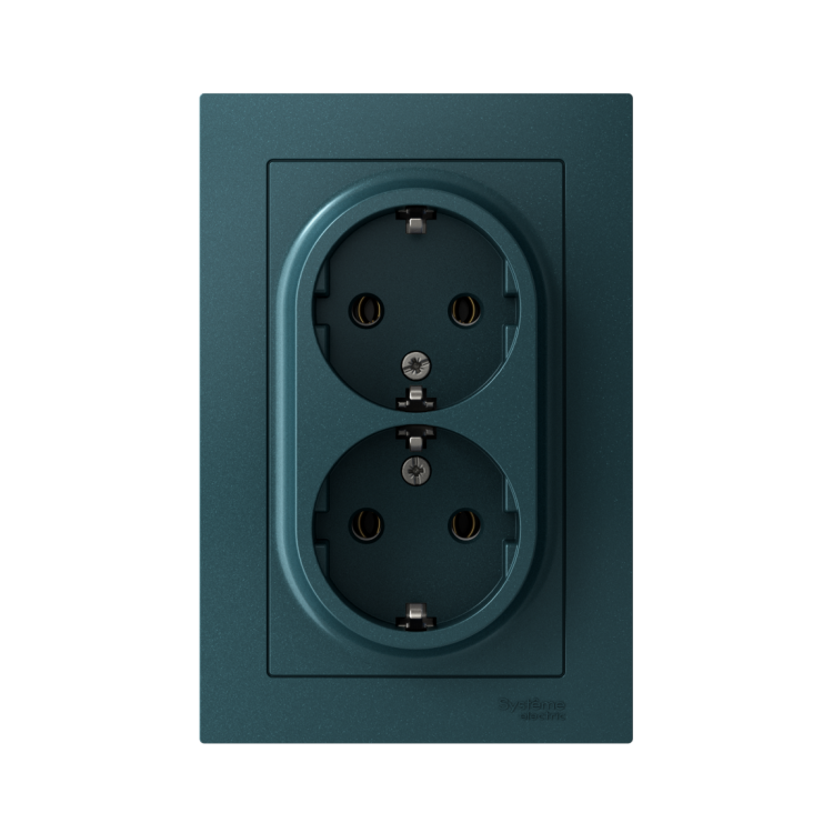 Розетка двойная в сборе Systeme Electric (ранее Schneider Electric) серии AtlasDesign в цвете изумруд с заземлением, без што рок подходит для сетей 250 В, на ток 16 А. Заземляющий контакт обеспечивает дополнительную защиту от удара электрическим током. Лицевые детали из качественного ABS-пластика, устойчивого к царапинам и УФ-излучению. Двойная розетка позволяет подключить два устройства в одном месте. Изделие поставляется в комплекте с рамкой того же цвета.