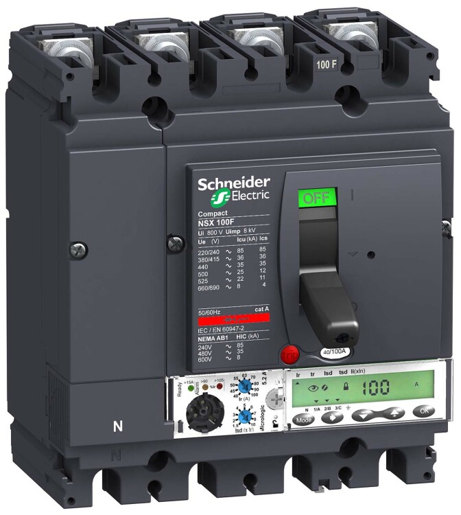 Автоматический выключатель Compact NSX100F Schneider Electric, исполнение – 4P 3d, 4d, 3d + N/2, 3d + OSN - номинальный ток 100 А - Icu = 36 kA 380/415 В - Ics = 100% Icu - с электронным расцепителем Micrologic 5.2 A (защита LSI, амперметр) - ШхВхГ – 140x161x86 мм - исполнение – стационарный - монтаж - на плате. Преимущества: Прямой доступ к экономии затрат, безопасность и защита, контроль и измерение параметров электроэнергии, надежность энергоснабжения, простота и удобство. Применения: Применение в системах электроснабжения объектов любого масштаба – от крупнейших промышленных предприятий до офисных зданий для защиты распределительных сетей, генераторов, кабелей большой протяженности, электродвигателей.