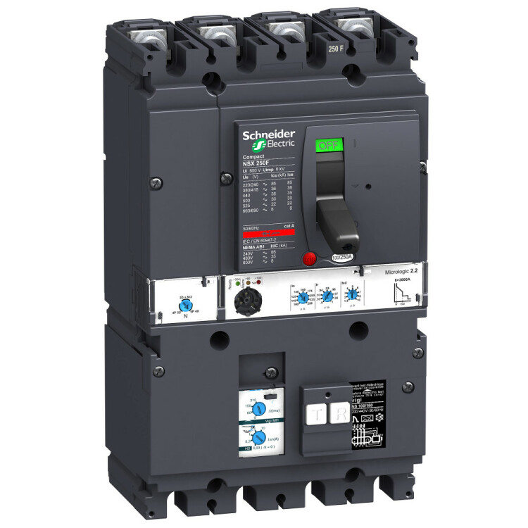 Автоматический выключатель дифференциального тока VigiCompact NSX250F Schneider Electric, 4P4d; номинальный ток 250 А; Icu = 36 кА 380/415 В; Ics=100% Icu; с электронным расцепителем Micrologic 2.2 (защита LSOI) и блоком дифференциальной защиты Vigi MH; ШхВхГ – 145x190x292 мм; исполнение – стационарный; монтаж - на DIN-рейке или плате.