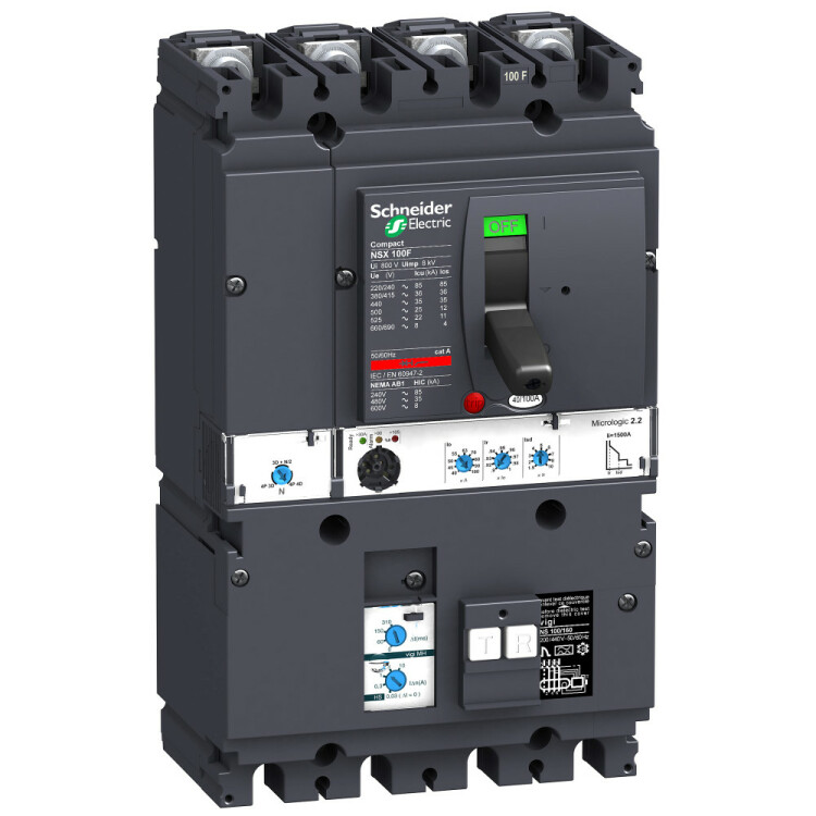 Автоматический выключатель дифференциального тока VigiComPact NSX100F Schneider Electric, исполнение – 4P 3d, 4d, 3d + N/2; номинальный ток 40 А; Icu = 36 kA 380/415 В; Ics = 100% Icu; с электронным расцепителем Micrologic 2.2 (защита LSOI) и блоком дифференциальной защиты Vigi MH; ШхВхГ – 1040х236х86 мм; исполнение – стационарный; монтаж - на плате.