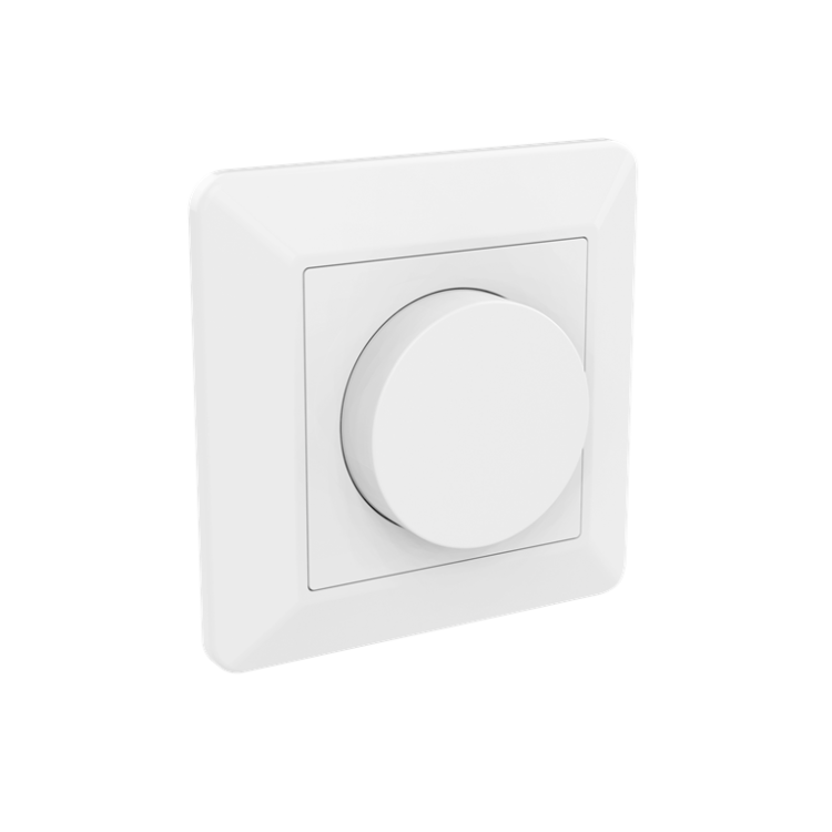 Диммер поворотный для ручной регулировки и выключения. Крышка и поворотный переключатель нейтрального белого цвета. Подходит для подключения 25 светильников.