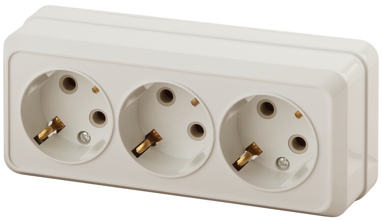 Розетка тройная 3-я серии Intro Quadro открытой установки цвет слоновая кость2-206-02. Номинальные характеристики 16А 250В. Розетка выполнена из керамики, стали и латуни, оснащёна винтовыми зажимами.