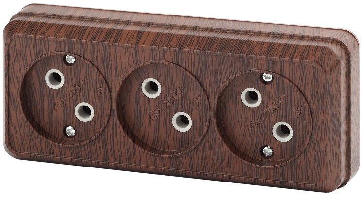 Розетка тройная 3-я серии Intro Quadro открытой установки цвет венге 2-205-10. Номинальные характеристики 16А 250В. Розетка выполнена из термопласта, стали и латуни, оснащёна винтовыми зажимами.