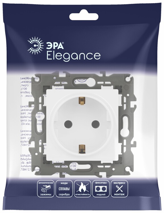 Розетка с заземлением Эра Elegance белый 14-2101-01. Оснащёна автоматическими клеммами для надёжной фиксации жил кабеля в механизме. Рамки приобретаются отдельно. Рамки Эра Elegance ПЛАСТИК: 1 пост 14-5001-хх, 2 поста 14-5002-хх, 3 поста 14-5003-хх, 4 поста 14-5004-хх, 5 постов 14-5005-хх; СТЕКЛО: 1 пост 14-5101-хх, 2 поста 14-5102-хх, 3 поста 14-5103-хх, 4 поста 14-5104-хх; МЕТАЛЛ: 1 пост 14-5201-хх, 2 поста 14-5202-хх, 3 поста 14-5203-хх, 4 поста 14-5204-хх; ДЕРЕВО: 1 пост 14-5301-хх, 2 поста 14-5302-хх, 3 поста 14-5303-хх, 4 поста 14-5304-хх (хх - код цвета: 00-прозрачный, 01-белый, белёный дуб, 02-слоновая кость, 03-алюминий, 04-шампань, 05-чёрный, чёрное дерево, 07-ясень, 09-дуб, 10-венге, 11-клён, 14-медь, 21-жёлтый, 22-оранжевый, 23-красный, 25-бордо, 26-лайм, 27-зелёный, 28-голубой, 29-синий, 30-розовый, 31-мокко, 32-серый, 41-сталь, 42-титан).