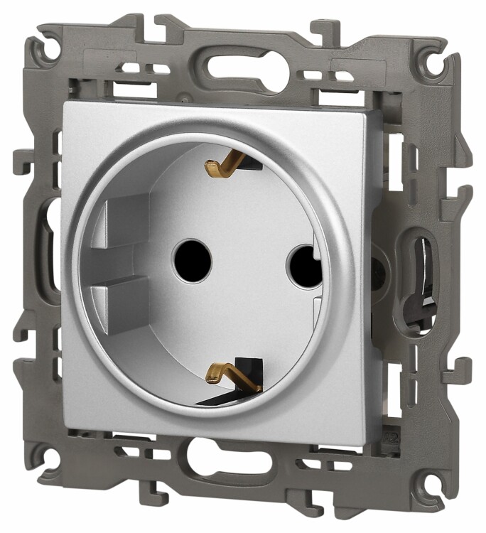 Розетка с заземлением со шторками Эра Elegance алюминий 14-2102-03. Оснащёна автоматическими клеммами для надёжной фиксации жил кабеля в механизме. Рамки приобретаются отдельно. Рамки Эра Elegance ПЛАСТИК: 1 пост 14-5001-хх, 2 поста 14-5002-хх, 3 поста 14-5003-хх, 4 поста 14-5004-хх, 5 постов 14-5005-хх; СТЕКЛО: 1 пост 14-5101-хх, 2 поста 14-5102-хх, 3 поста 14-5103-хх, 4 поста 14-5104-хх; МЕТАЛЛ: 1 пост 14-5201-хх, 2 поста 14-5202-хх, 3 поста 14-5203-хх, 4 поста 14-5204-хх; ДЕРЕВО: 1 пост 14-5301-хх, 2 поста 14-5302-хх, 3 поста 14-5303-хх, 4 поста 14-5304-хх (хх - код цвета: 00-прозрачный, 01-белый, белёный дуб, 02-слоновая кость, 03-алюминий, 04-шампань, 05-чёрный, чёрное дерево, 07-ясень, 09-дуб, 10-венге, 11-клён, 14-медь, 21-жёлтый, 22-оранжевый, 23-красный, 25-бордо, 26-лайм, 27-зелёный, 28-голубой, 29-синий, 30-розовый, 31-мокко, 32-серый, 41-сталь, 42-титан).