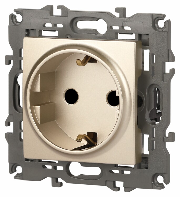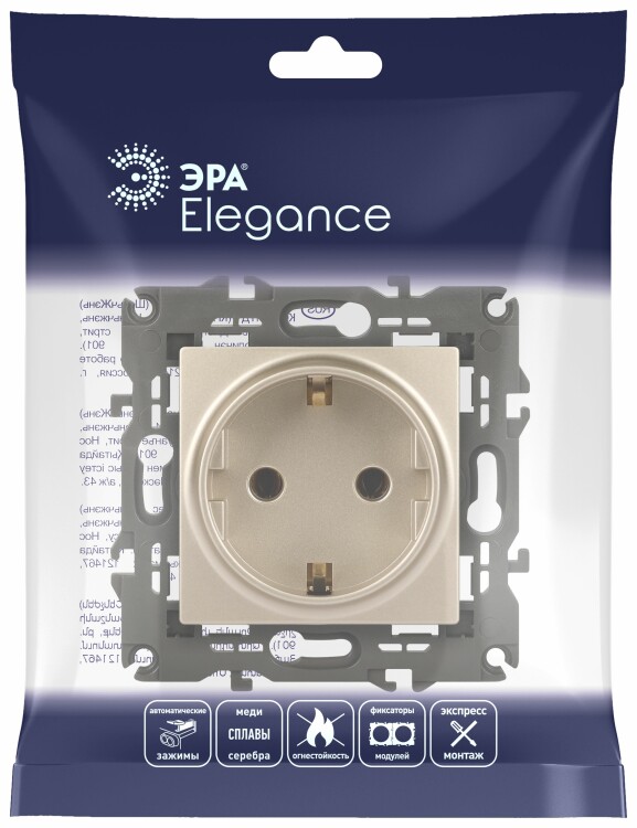 Розетка с заземлением со шторками Эра Elegance шампань 14-2102-04. Оснащёна автоматическими клеммами для надёжной фиксации жил кабеля в механизме. Рамки приобретаются отдельно. Рамки Эра Elegance ПЛАСТИК: 1 пост 14-5001-хх, 2 поста 14-5002-хх, 3 поста 14-5003-хх, 4 поста 14-5004-хх, 5 постов 14-5005-хх; СТЕКЛО: 1 пост 14-5101-хх, 2 поста 14-5102-хх, 3 поста 14-5103-хх, 4 поста 14-5104-хх; МЕТАЛЛ: 1 пост 14-5201-хх, 2 поста 14-5202-хх, 3 поста 14-5203-хх, 4 поста 14-5204-хх; ДЕРЕВО: 1 пост 14-5301-хх, 2 поста 14-5302-хх, 3 поста 14-5303-хх, 4 поста 14-5304-хх (хх - код цвета: 00-прозрачный, 01-белый, белёный дуб, 02-слоновая кость, 03-алюминий, 04-шампань, 05-чёрный, чёрное дерево, 07-ясень, 09-дуб, 10-венге, 11-клён, 14-медь, 21-жёлтый, 22-оранжевый, 23-красный, 25-бордо, 26-лайм, 27-зелёный, 28-голубой, 29-синий, 30-розовый, 31-мокко, 32-серый, 41-сталь, 42-титан).
