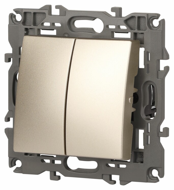 Выключатель 2-клавишный Эра Elegance шампань 14-1104-04. Оснащён автоматическими клеммами для надёжной фиксации жил кабеля в механизме. Рамки приобретаются отдельно.