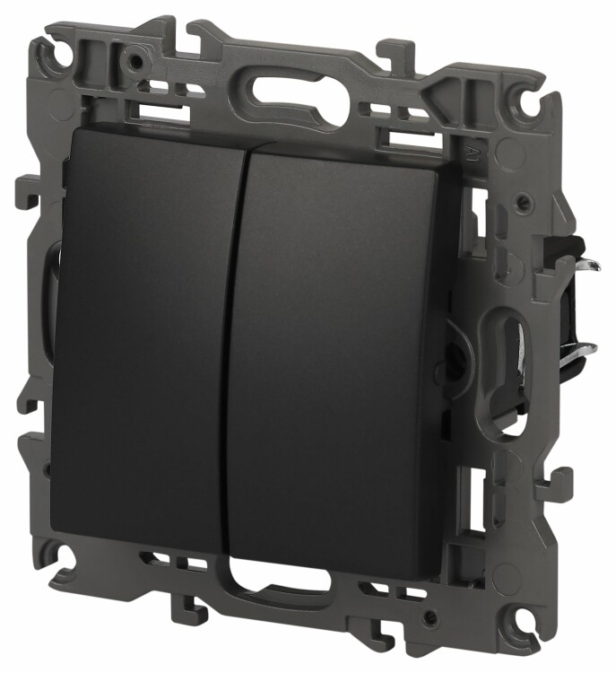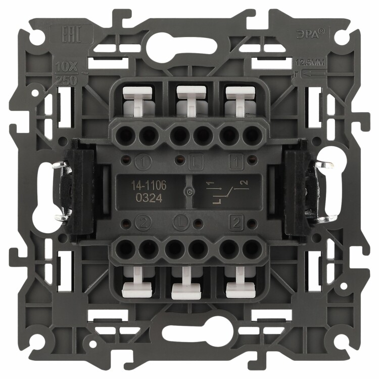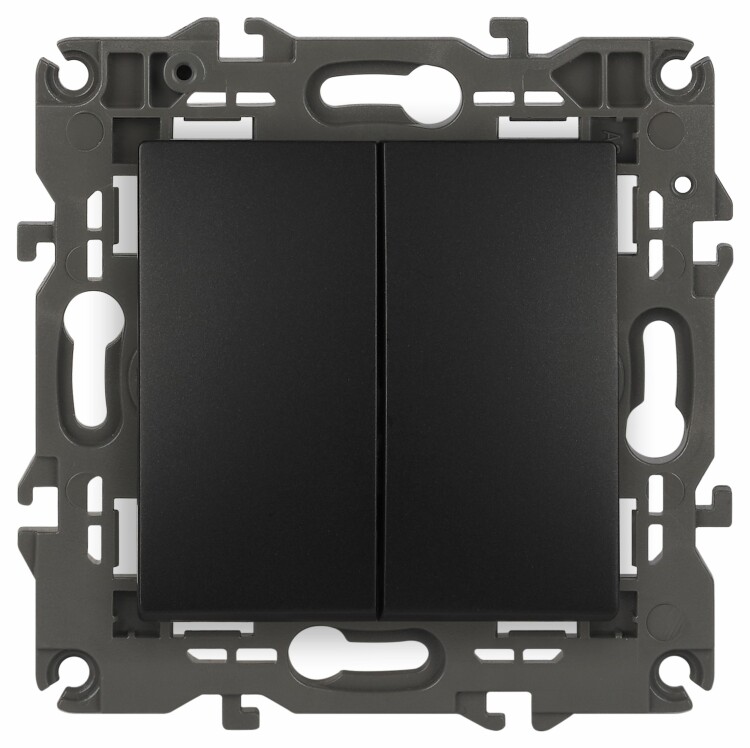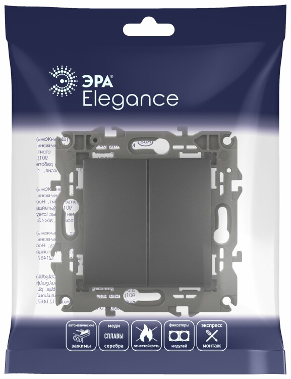 Выключатель 2-клавишный проходной Эра Elegance а нтрацит 14-1106-05. Оснащён автоматическими клеммами для надёжной фиксации жил кабеля в механизме. Рамки приобретаются отдельно.