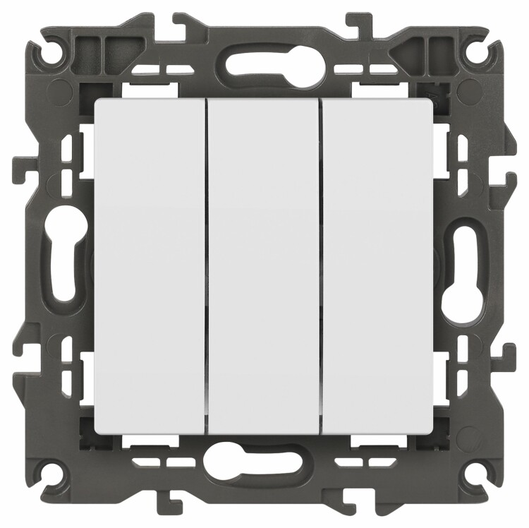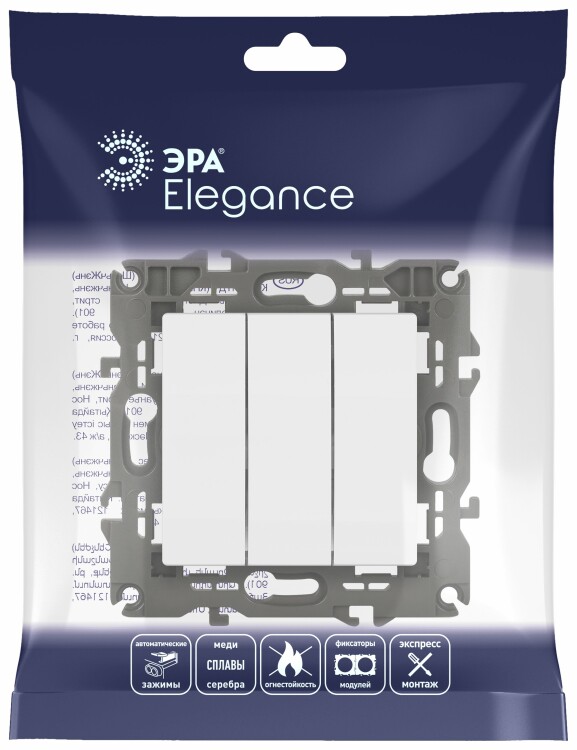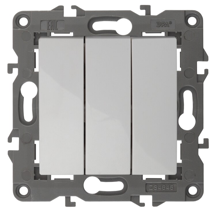Выключатель 3-клавишный Эра Elegance белый 14-1107-01. Рамки приобретаются отдельно. Рамки Эра Elegance ПЛАСТИК: 1 пост 14-5001-хх, 2 поста 14-5002-хх, 3 поста 14-5003-хх, 4 поста 14-5004-хх, 5 постов 14-5005-хх; СТЕКЛО: 1 пост 14-5101-хх, 2 поста 14-5102-хх, 3 поста 14-5103-хх, 4 поста 14-5104-хх; МЕТАЛЛ: 1 пост 14-5201-хх, 2 поста 14-5202-хх, 3 поста 14-5203-хх, 4 поста 14-5204-хх; ДЕРЕВО: 1 пост 14-5301-хх, 2 поста 14-5302-хх, 3 поста 14-5303-хх, 4 поста 14-5304-хх (хх - код цвета: 00-прозрачный, 01-белый, белёный дуб, 02-слоновая кость, 03-алюминий, 04-шампань, 05-чёрный, чёрное дерево, 07-ясень, 09-дуб, 10-венге, 11-клён, 14-медь, 21-жёлтый, 22-оранжевый, 23-красный, 25-бордо, 26-лайм, 27-зелёный, 28-голубой, 29-синий, 30-розовый, 31-мокко, 32-серый, 41-сталь, 42-титан).