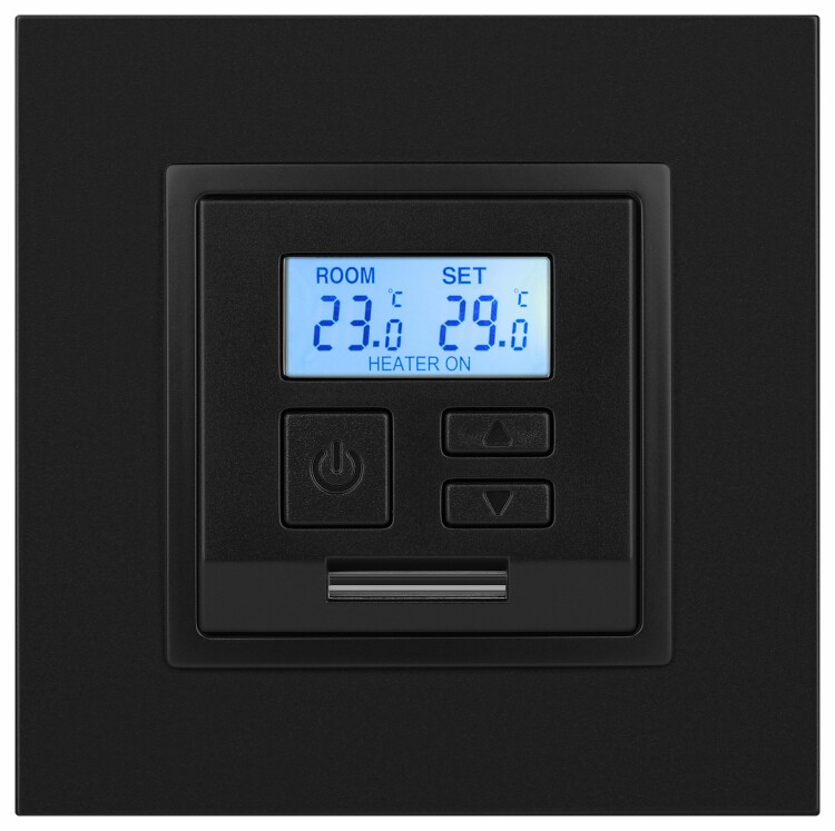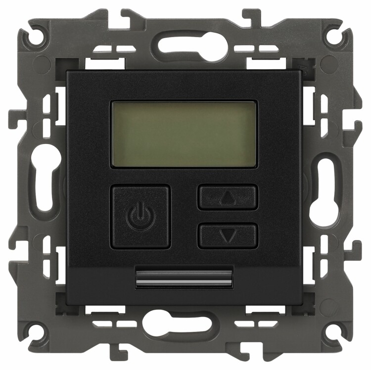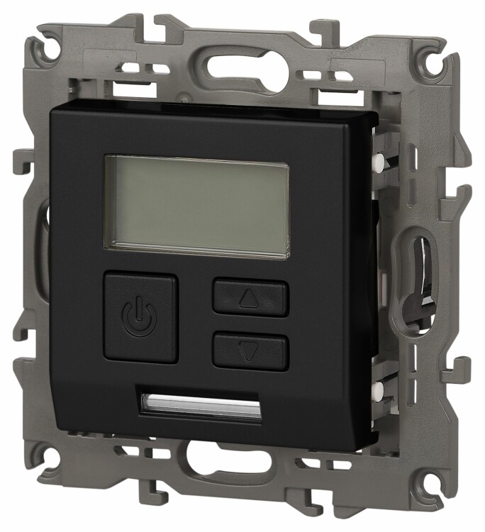 Терморегулятор теплый пол / отопление электронный серии Эра Elegance цвет антрацит 14-4111-05. Рамки приобретаются отдельно. Рамки Эра Elegance ПЛАСТИК: 1 пост 14-5001-хх, 2 поста 14-5002-хх, 3 поста 14-5003-хх, 4 поста 14-5004-хх, 5 постов 14-5005-хх; СТЕКЛО: 1 пост 14-5101-хх, 2 поста 14-5102-хх, 3 поста 14-5103-хх, 4 поста 14-5104-хх; МЕТАЛЛ: 1 пост 14-5201-хх, 2 поста 14-5202-хх, 3 поста 14-5203-хх, 4 поста 14-5204-хх; ДЕРЕВО: 1 пост 14-5301-хх, 2 поста 14-5302-хх, 3 поста 14-5303-хх, 4 поста 14-5304-хх (хх - код цвета: 00-прозрачный, 01-белый, белёный дуб, 02-слоновая кость, 03-алюминий, 04-шампань, 05-чёрный, чёрное дерево, 07-ясень, 09-дуб, 10-венге, 11-клён, 14-медь, 21-жёлтый, 22-оранжевый, 23-красный, 25-бордо, 26-лайм, 27-зелёный, 28-голубой, 29-синий, 30-розовый, 31-мокко, 32-серый, 41-сталь, 42-титан).