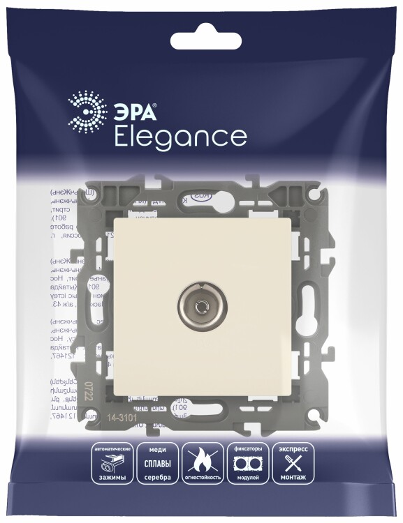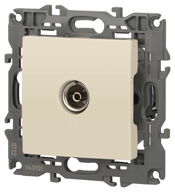 Розетка телевизионная одиночная серии Эра Elegance цвет слоновая кость 14-3101-02. Рамки приобретаются отдельно. Рамки Эра Elegance ПЛАСТИК: 1 пост 14-5001-хх, 2 поста 14-5002-хх, 3 поста 14-5003-хх, 4 поста 14-5004-хх, 5 постов 14-5005-хх; СТЕКЛО: 1 пост 14-5101-хх, 2 поста 14-5102-хх, 3 поста 14-5103-хх, 4 поста 14-5104-хх; МЕТАЛЛ: 1 пост 14-5201-хх, 2 поста 14-5202-хх, 3 поста 14-5203-хх, 4 поста 14-5204-хх; ДЕРЕВО: 1 пост 14-5301-хх, 2 поста 14-5302-хх, 3 поста 14-5303-хх, 4 поста 14-5304-хх (хх - код цвета: 00-прозрачный, 01-белый, белёный дуб, 02-слоновая кость, 03-алюминий, 04-шампань, 05-чёрный, чёрное дерево, 07-ясень, 09-дуб, 10-венге, 11-клён, 14-медь, 21-жёлтый, 22-оранжевый, 23-красный, 25-бордо, 26-лайм, 27-зелёный, 28-голубой, 29-синий, 30-розовый, 31-мокко, 32-серый, 41-сталь, 42-титан).