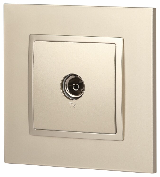 Розетка телевизионная одиночная серии Эра Elegance цвет шампань 14-3101-04. Рамки приобретаются отдельно. Рамки Эра Elegance ПЛАСТИК: 1 пост 14-5001-хх, 2 поста 14-5002-хх, 3 поста 14-5003-хх, 4 поста 14-5004-хх, 5 постов 14-5005-хх; СТЕКЛО: 1 пост 14-5101-хх, 2 поста 14-5102-хх, 3 поста 14-5103-хх, 4 поста 14-5104-хх; МЕТАЛЛ: 1 пост 14-5201-хх, 2 поста 14-5202-хх, 3 поста 14-5203-хх, 4 поста 14-5204-хх; ДЕРЕВО: 1 пост 14-5301-хх, 2 поста 14-5302-хх, 3 поста 14-5303-хх, 4 поста 14-5304-хх (хх - код цвета: 00-прозрачный, 01-белый, белёный дуб, 02-слоновая кость, 03-алюминий, 04-шампань, 05-чёрный, чёрное дерево, 07-ясень, 09-дуб, 10-венге, 11-клён, 14-медь, 21-жёлтый, 22-оранжевый, 23-красный, 25-бордо, 26-лайм, 27-зелёный, 28-голубой, 29-синий, 30-розовый, 31-мокко, 32-серый, 41-сталь, 42-титан).