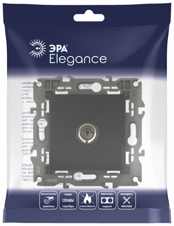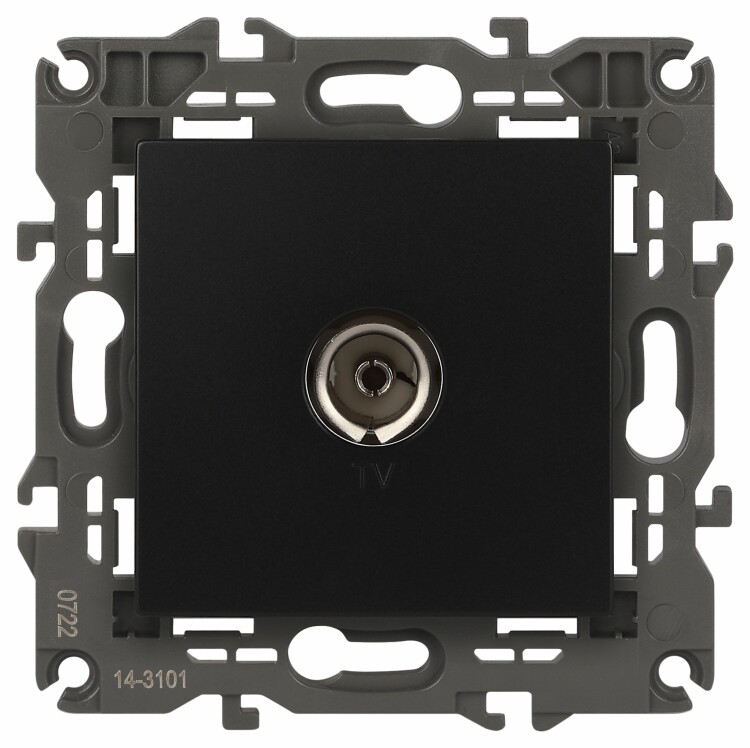 Розетка телевизионная одиночная серии Эра Elegance цвет антрацит 14-3101-05. Рамки приобретаются отдельно. Рамки Эра Elegance ПЛАСТИК: 1 пост 14-5001-хх, 2 поста 14-5002-хх, 3 поста 14-5003-хх, 4 поста 14-5004-хх, 5 постов 14-5005-хх; СТЕКЛО: 1 пост 14-5101-хх, 2 поста 14-5102-хх, 3 поста 14-5103-хх, 4 поста 14-5104-хх; МЕТАЛЛ: 1 пост 14-5201-хх, 2 поста 14-5202-хх, 3 поста 14-5203-хх, 4 поста 14-5204-хх; ДЕРЕВО: 1 пост 14-5301-хх, 2 поста 14-5302-хх, 3 поста 14-5303-хх, 4 поста 14-5304-хх (хх - код цвета: 00-прозрачный, 01-белый, белёный дуб, 02-слоновая кость, 03-алюминий, 04-шампань, 05-чёрный, чёрное дерево, 07-ясень, 09-дуб, 10-венге, 11-клён, 14-медь, 21-жёлтый, 22-оранжевый, 23-красный, 25-бордо, 26-лайм, 27-зелёный, 28-голубой, 29-синий, 30-розовый, 31-мокко, 32-серый, 41-сталь, 42-титан).
