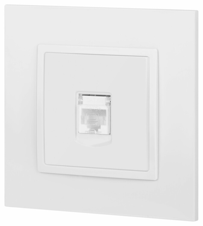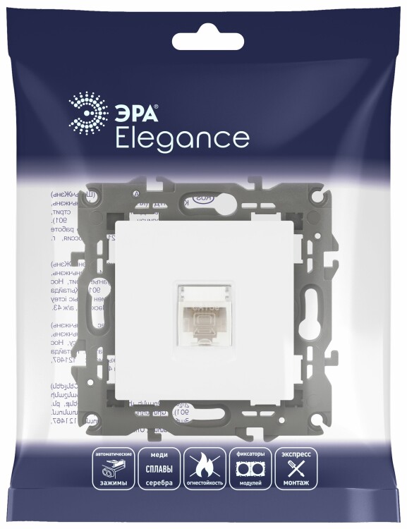 Розетка интернет RJ45 серии Эра Elegance цвет белый 14-3107-01. Рамки приобретаются отдельно. Рамки Эра Elegance ПЛАСТИК: 1 пост 14-5001-хх, 2 поста 14-5002-хх, 3 поста 14-5003-хх, 4 поста 14-5004-хх, 5 постов 14-5005-хх; СТЕКЛО: 1 пост 14-5101-хх, 2 поста 14-5102-хх, 3 поста 14-5103-хх, 4 поста 14-5104-хх; МЕТАЛЛ: 1 пост 14-5201-хх, 2 поста 14-5202-хх, 3 поста 14-5203-хх, 4 поста 14-5204-хх; ДЕРЕВО: 1 пост 14-5301-хх, 2 поста 14-5302-хх, 3 поста 14-5303-хх, 4 поста 14-5304-хх (хх - код цвета: 00-прозрачный, 01-белый, белёный дуб, 02-слоновая кость, 03-алюминий, 04-шампань, 05-чёрный, чёрное дерево, 07-ясень, 09-дуб, 10-венге, 11-клён, 14-медь, 21-жёлтый, 22-оранжевый, 23-красный, 25-бордо, 26-лайм, 27-зелёный, 28-голубой, 29-синий, 30-розовый, 31-мокко, 32-серый, 41-сталь, 42-титан).