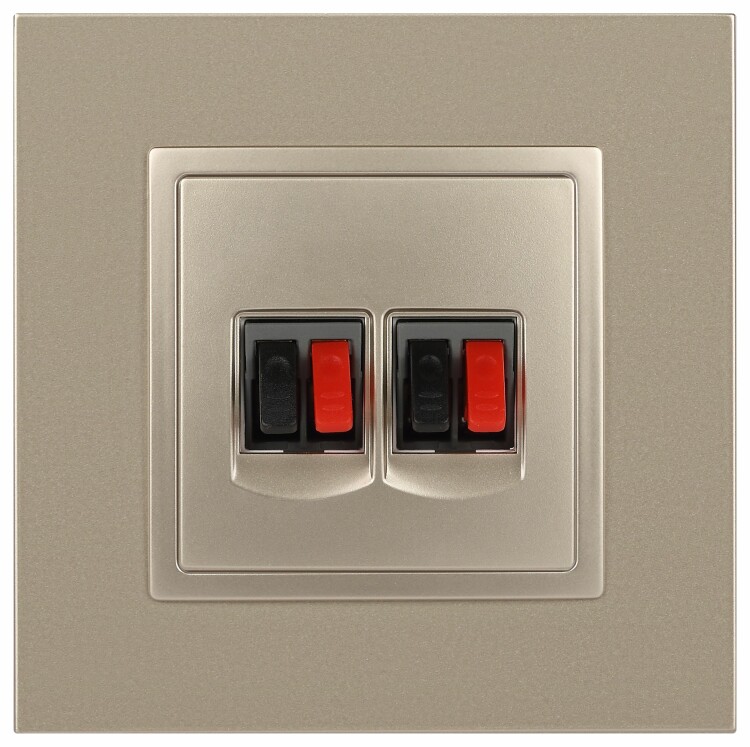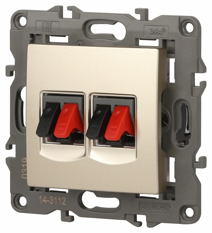 Розетка двойная аудио стерео серии Эра Elegance цвет шампань 14-3112-04. Рамки приобретаются отдельно. Рамки Эра Elegance ПЛАСТИК: 1 пост 14-5001-хх, 2 поста 14-5002-хх, 3 поста 14-5003-хх, 4 поста 14-5004-хх, 5 постов 14-5005-хх; СТЕКЛО: 1 пост 14-5101-хх, 2 поста 14-5102-хх, 3 поста 14-5103-хх, 4 поста 14-5104-хх; МЕТАЛЛ: 1 пост 14-5201-хх, 2 поста 14-5202-хх, 3 поста 14-5203-хх, 4 поста 14-5204-хх; ДЕРЕВО: 1 пост 14-5301-хх, 2 поста 14-5302-хх, 3 поста 14-5303-хх, 4 поста 14-5304-хх (хх - код цвета: 00-прозрачный, 01-белый, белёный дуб, 02-слоновая кость, 03-алюминий, 04-шампань, 05-чёрный, чёрное дерево, 07-ясень, 09-дуб, 10-венге, 11-клён, 14-медь, 21-жёлтый, 22-оранжевый, 23-красный, 25-бордо, 26-лайм, 27-зелёный, 28-голубой, 29-синий, 30-розовый, 31-мокко, 32-серый, 41-сталь, 42-титан).