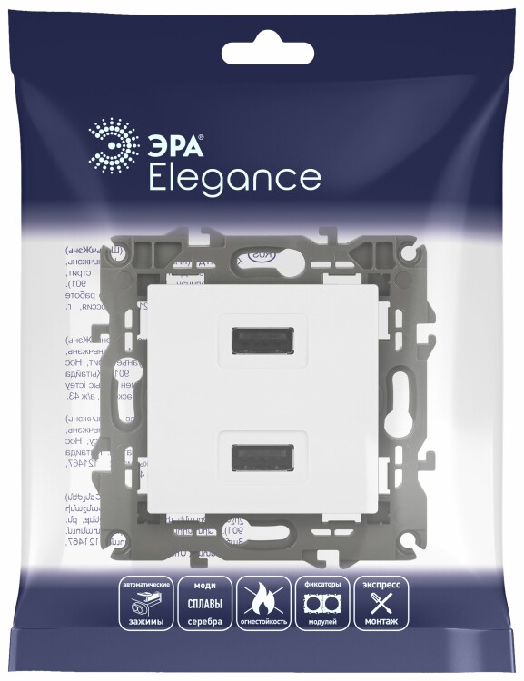 Устройство зарядное USB серии Эра Elegance цвет белый 14-4110-01. Номинальные характеристики . Оснащёно автоматическими клеммами для надёжной фиксации жил кабеля в механизме. Рамки приобретаются отдельно. Рамки Эра Elegance ПЛАСТИК: 1 пост 14-5001-хх, 2 поста 14-5002-хх, 3 поста 14-5003-хх, 4 поста 14-5004-хх, 5 постов 14-5005-хх; СТЕКЛО: 1 пост 14-5101-хх, 2 поста 14-5102-хх, 3 поста 14-5103-хх, 4 поста 14-5104-хх; МЕТАЛЛ: 1 пост 14-5201-хх, 2 поста 14-5202-хх, 3 поста 14-5203-хх, 4 поста 14-5204-хх; ДЕРЕВО: 1 пост 14-5301-хх, 2 поста 14-5302-хх, 3 поста 14-5303-хх, 4 поста 14-5304-хх (хх - код цвета: 00-прозрачный, 01-белый, белёный дуб, 02-слоновая кость, 03-алюминий, 04-шампань, 05-чёрный, чёрное дерево, 07-ясень, 09-дуб, 10-венге, 11-клён, 14-медь, 21-жёлтый, 22-оранжевый, 23-красный, 25-бордо, 26-лайм, 27-зелёный, 28-голубой, 29-синий, 30-розовый, 31-мокко, 32-серый, 41-сталь, 42-титан).