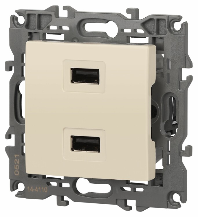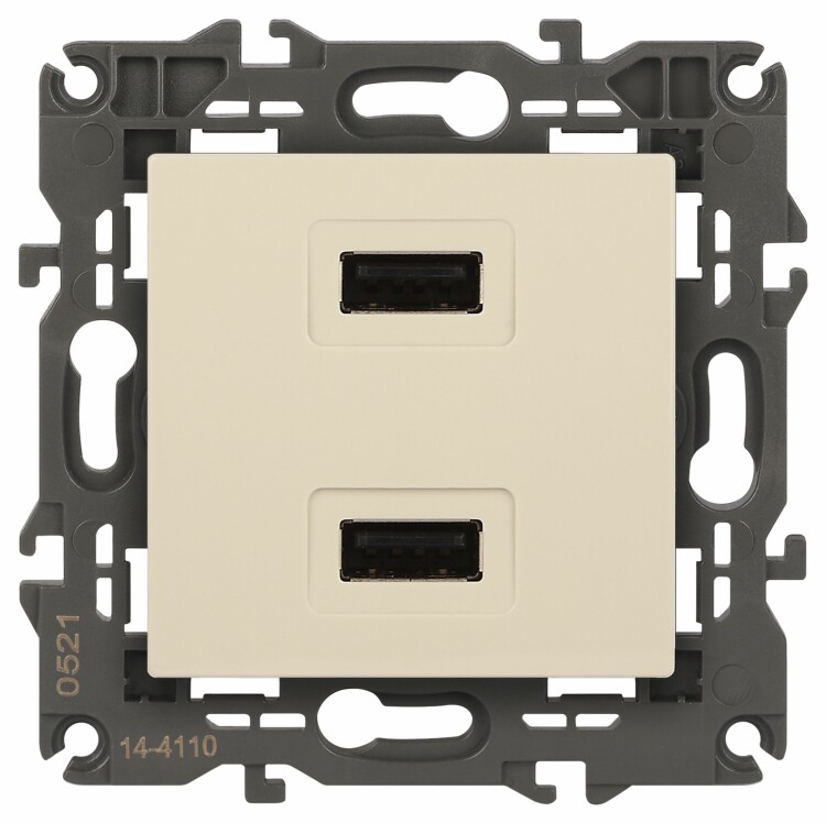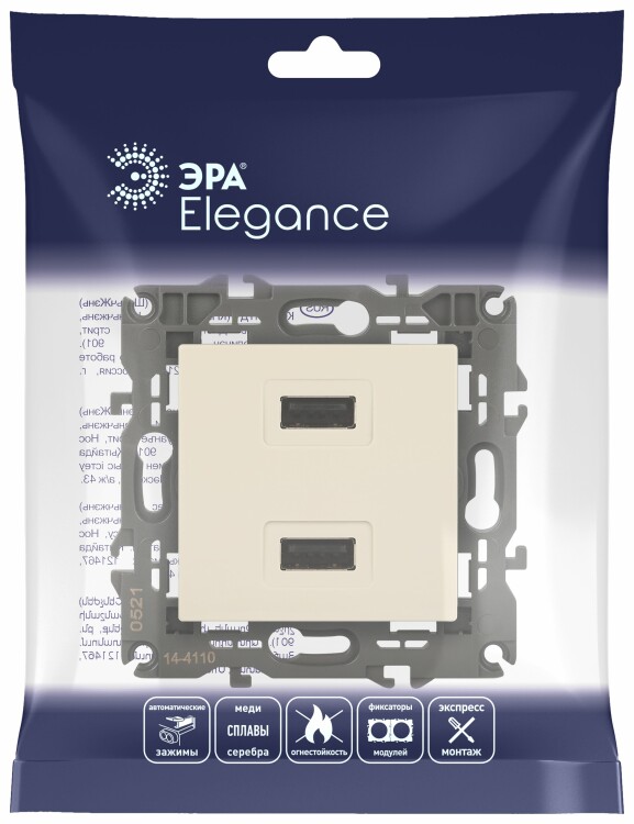 Устройство зарядное USB серии Эра Elegance цвет слоновая кость 14-4110-02. Номинальные характеристики . Оснащёно автоматическими клеммами для надёжной фиксации жил кабеля в механизме. Рамки приобретаются отдельно. Рамки Эра Elegance ПЛАСТИК: 1 пост 14-5001-хх, 2 поста 14-5002-хх, 3 поста 14-5003-хх, 4 поста 14-5004-хх, 5 постов 14-5005-хх; СТЕКЛО: 1 пост 14-5101-хх, 2 поста 14-5102-хх, 3 поста 14-5103-хх, 4 поста 14-5104-хх; МЕТАЛЛ: 1 пост 14-5201-хх, 2 поста 14-5202-хх, 3 поста 14-5203-хх, 4 поста 14-5204-хх; ДЕРЕВО: 1 пост 14-5301-хх, 2 поста 14-5302-хх, 3 поста 14-5303-хх, 4 поста 14-5304-хх (хх - код цвета: 00-прозрачный, 01-белый, белёный дуб, 02-слоновая кость, 03-алюминий, 04-шампань, 05-чёрный, чёрное дерево, 07-ясень, 09-дуб, 10-венге, 11-клён, 14-медь, 21-жёлтый, 22-оранжевый, 23-красный, 25-бордо, 26-лайм, 27-зелёный, 28-голубой, 29-синий, 30-розовый, 31-мокко, 32-серый, 41-сталь, 42-титан).