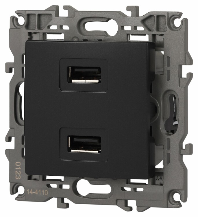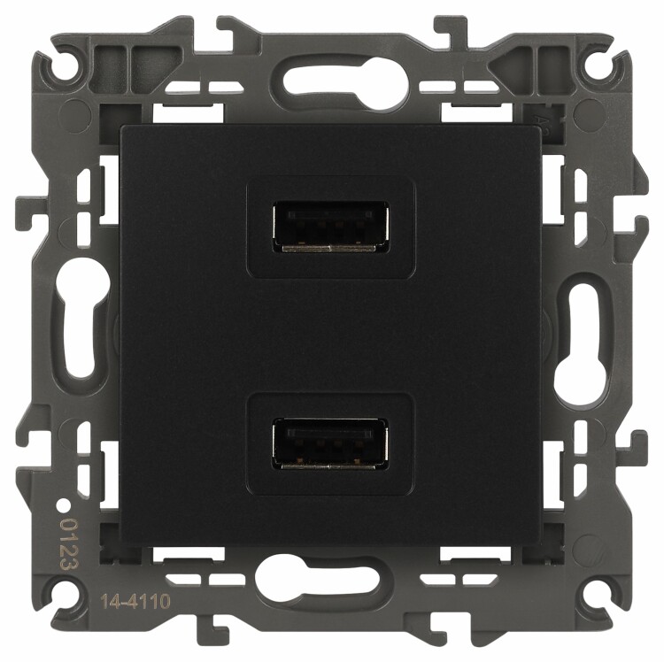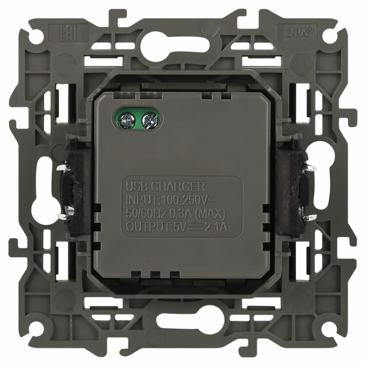 Устройство зарядное USB серии Эра Elegance цвет антрацит 14-4110-05. Номинальные характеристики . Оснащёно автоматическими клеммами для надёжной фиксации жил кабеля в механизме. Рамки приобретаются отдельно. Рамки Эра Elegance ПЛАСТИК: 1 пост 14-5001-хх, 2 поста 14-5002-хх, 3 поста 14-5003-хх, 4 поста 14-5004-хх, 5 постов 14-5005-хх; СТЕКЛО: 1 пост 14-5101-хх, 2 поста 14-5102-хх, 3 поста 14-5103-хх, 4 поста 14-5104-хх; МЕТАЛЛ: 1 пост 14-5201-хх, 2 поста 14-5202-хх, 3 поста 14-5203-хх, 4 поста 14-5204-хх; ДЕРЕВО: 1 пост 14-5301-хх, 2 поста 14-5302-хх, 3 поста 14-5303-хх, 4 поста 14-5304-хх (хх - код цвета: 00-прозрачный, 01-белый, белёный дуб, 02-слоновая кость, 03-алюминий, 04-шампань, 05-чёрный, чёрное дерево, 07-ясень, 09-дуб, 10-венге, 11-клён, 14-медь, 21-жёлтый, 22-оранжевый, 23-красный, 25-бордо, 26-лайм, 27-зелёный, 28-голубой, 29-синий, 30-розовый, 31-мокко, 32-серый, 41-сталь, 42-титан).