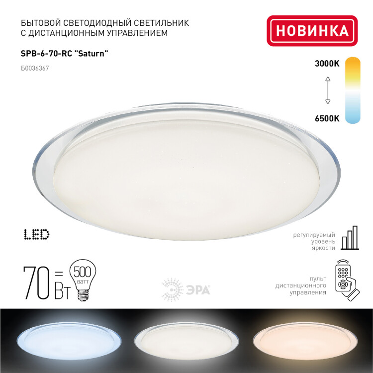 Потолочный светильник SPB-6 мощностью 70 Вт из космической коллекции Saturn. Но лаконичный дизайн не последнее преимущество этой модели. В комплекте с потолочным светильником идет пульт управления, с помощью которого происходит регулировка времени отключения (через 30 мин или 1 ч), яркости и цветовой температуры. Круглый потолочный светильник работает на светодиодах, которые не перегорают и экономят до 80. Еще одним приятным достоинством люстры является ночной режим, который светит на минимальной яркости и заботится о комфорте глаз после темноты. Пусть Вас не смущает простой дизайн потолочного светильника - он отлично дополнит минималистичный и аккуратный интерьер в комнате. Приобретайте светодиодный светильник SPB-6 Saturn от бренда ЭРА.