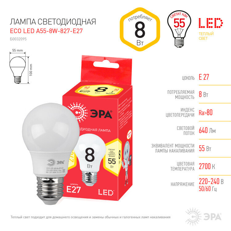 Срок службы лампы продолжительный и составляет 25 000 часов. Лампа обладает стабильным световым потоком на протяжении всего срока службы не мерцает и не тускнеет. Работоспособность лампы сохраняется даже в том случае, если выходит из строя один или несколько светодиодов. В сравнении со стандартной лампой накаливания, светодиодная лампа ЭРА обеспечивает до 90% экономии электроэнергии.