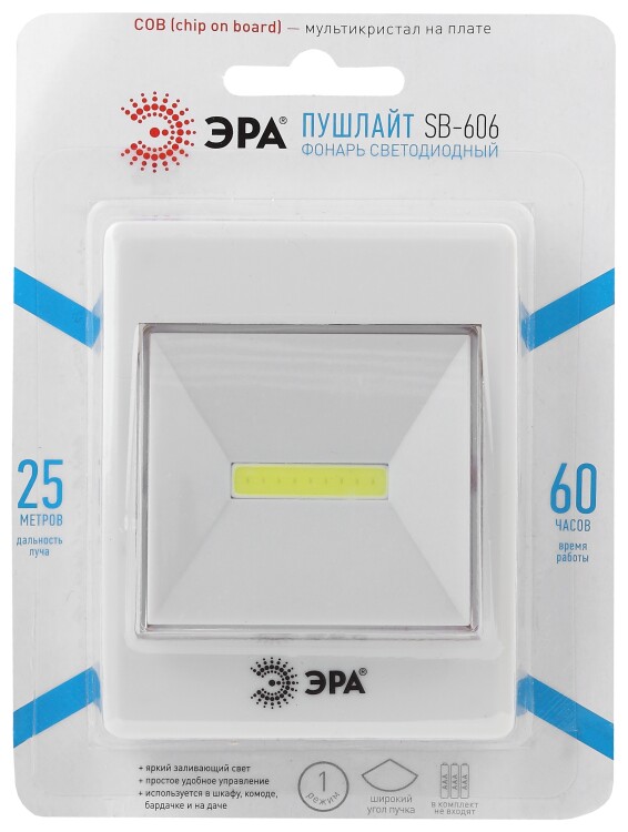 ЭРА SB-606 - компактный светодиодный фонарь-пушлайт, работающий по принципу традиционного выключателя. Создан для освещения помещений без стационарного света и для дополнительной подсветки затемнённых мест. Сверхъяркий и суперэкономичный свет chip on board - мультикристалл на плате. Широкий угол светового пучка даёт качественное заливающее освещение. Быстрое закрепление на любой гладкой поверхности, удобное включение и простота в управлении. Чтобы закрепить фонарь на любую ровную поверхность, потребуется всего минута. Самоклеящаяся основа и само устройство соединяются друг с другом при помощи прочной липучки. Это даёт большое преимущество при последующих заменах батареек - фонарь легко снимается и снова закрепляется на текстильную застёжку. Имеется и дополнительный вариант крепления - углубление для подвешивания на шуруп или гвоздь. В самом центре выключателя расположена LED-плата с целым рядом мелких и очень ярких светодиодов. это промышленная технология, адаптированная для универсальных целей. Получился яркий, но при этом ровный мягкий свет, идеальный для бытовой подсветки. LED-мультикристаллы не тускнеют со временем и не нуждаются в замене. Они обеспечивают максимально широкий угол освещения с дальностью 25 метров. Фонарь-пушлайт ЭРА SB-606 идеален для подсветки полок шкафов и ящиков комодов, для дополнительной подсветки кухонных рабочих поверхностей, для освещения подсобок. Устройство экономично - от одного комплекта батареек (3хААА) работает свыше 60 активных часов.