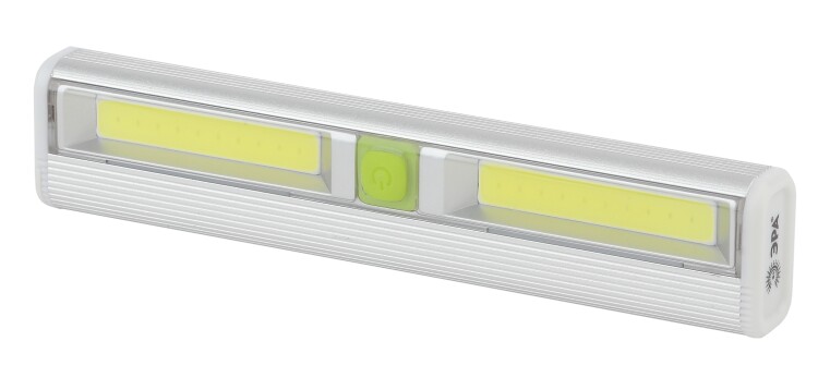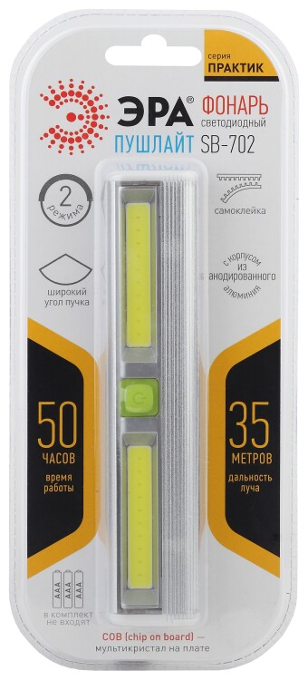 SB-702 - светодиодный фонарь-пушлайт с двумя режимами работы и несколькими типами креплений - самоклеющаяся основа, магнит, два отверстия для подвешивания на болты/гвозди. Прочный корпус из анодированного алюминия. Широкий угол светового пучка. Яркий заливающий свет, который не слепит глаза и не мерцает. Компактный фонарь-пушлайт легко крепится к любой гладкой поверхности и становится отличным решением для освещения пространств, где нет стационарного света, или для дополнительной подсветки затемнённых мест. ЭРА SB-702 размещают в подсобных помещениях, на отдалённых полках гардеробных, под кухонными шкафами. Он включается и отключается быстрым нажатием на кнопку, расположенную в центре корпуса. Повторное нажатие кнопки активирует эконом-режим с 30% яркости. Кнопка включения покрыта мягким прорезиненным материалом, препятствующим скольжению. Даёт широкое заливающее освещение при помощи двух светодиодных пластин СОВ (chip on board - мультикристал на плате), это промышленная технология, адаптированная для универсальных целей. Получился яркий, но при этом ровный мягкий свет, идеальный для бытовой подсветки. LED-платы не тускнеют со временем и не нуждаются в замене. Для того, чтобы закрепить фонарь в любом удобном месте, нужно просто отсоединить защитную плёнку и приклеить устройство с помощью прочной самоклеющейся основы. Одна минута - и вы обеспечены качественной подсветкой. На металлические поверхности ЭРА SB-702 крепится и вовсе за считанные секунды - в корпус встроен магнит. Устройство экономично - от одного комплекта батареек (3хААА) работает 50 активных часов.