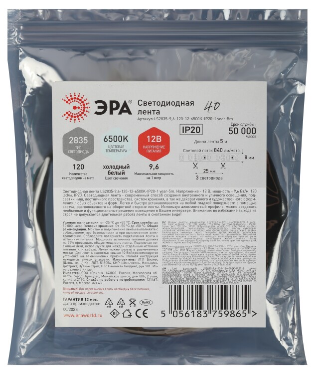 Светодиодная лента LS2835-9,6-120-12-6500K-IP20-1 year-5m со степенью защиты от пыли и влаги IP20 - современный способ создания внутреннего освещения, подсветки ниш, лестничного пространства, систем хранения, а также декоративного и художественного оформления любых объектов и форм. Легко и быстро устанавливается на любой гладкой поверхности с помощью скотча, расположенного на оборотной стороне ленты. Используя алюминиевый профиль, можно создавать необычные и функциональные решения освещения в Вашем интерьере. Рабочее напряжение ленты составляет 12 В, а мощность равна 9,6 Вт/м. Светодиодная лента обладает световым потоком 840 лм/м с холодным белым цветом свечения (6500К).