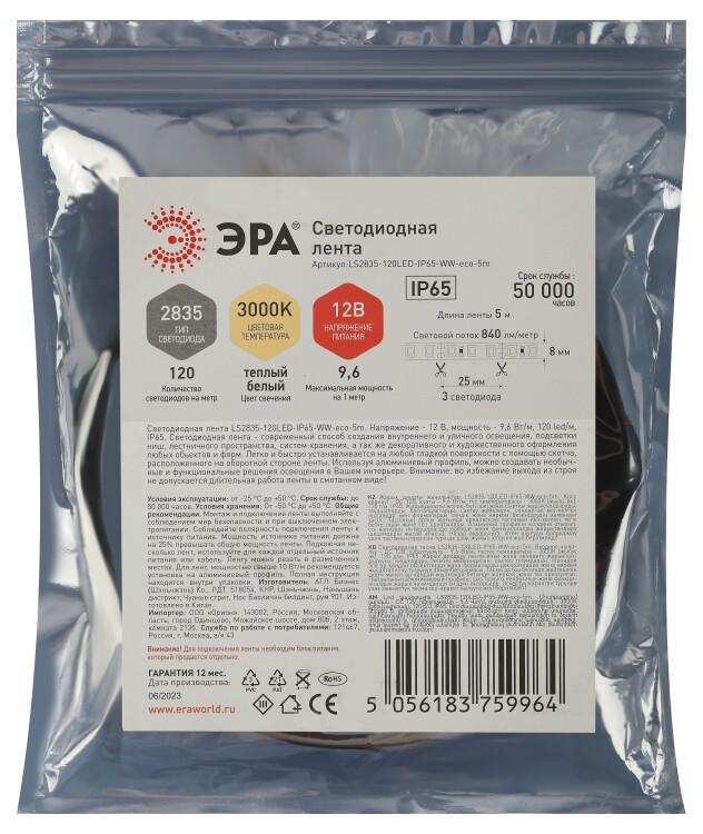 Светодиодная лента LS2835-120LED-IP65-WW-eco-5m со степенью защиты от пыли и влаги IP65 - современный способ создания внутреннего освещения, подсветки ниш, лестничного пространства, систем хранения, а также декоративного и художественного оформления любых объектов и форм в помещениях с повышенным уровнем влажности и уличного освещения. Легко и быстро устанавливается на любой гладкой поверхности с помощью скотча, расположенного на оборотной стороне ленты. Используя алюминиевый профиль, можно создавать необычные и функциональные решения освещения в Вашем интерьере. Рабочее напряжение ленты составляет 12 В, а мощность равна 9,6 Вт/м. Светодиодная лента обладает световым потоком 840 лм/м с теплым белым цветом свечения (3000К).