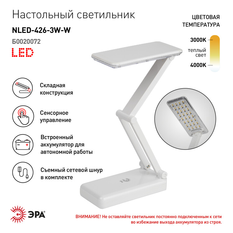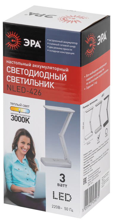Настольный аккумуляторный светодиодный светильник ЭРА NLED-426-3W-W может работать автономно. Просто зарядите его и используйте там, где он нужен. Не важно, есть ли поблизости розетка вам будет комфортно. Можно выбрать максимальную яркость или приглушенный свет. Часто этот светильник используют в качестве бытового фонарика. У светильника съемный сетевой шнур в комплекте и складная конструкция для легкости его перевозки и компактного хранения. ВНИМАНИЕ. Не оставляйте светильник постоянно подключенным к сети во избежание выхода аккумулятора из строя. Время зарядки - не более 14 ч. После полной зарядки используйте светильник в автономном режиме не менее 2 часов. Если аккумулятор полностью разряжен, светильник не включается, его необходимо заряжать не менее 14 часов в выключенном состоянии.