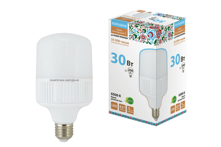 Лампа светодиодная T-30 Вт-230 В-6500 К–E27(100x178 мм) НАРОДНАЯ (кр.1шт)
