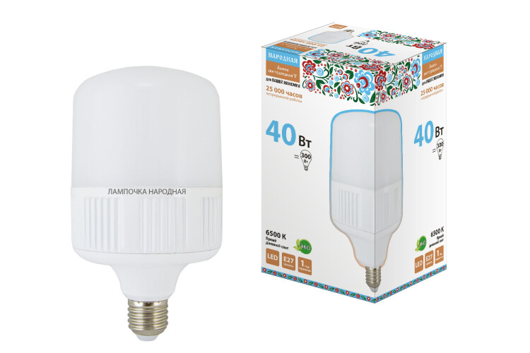 Лампа светодиодная T-40 Вт-230 В-6500 К–E27 (120x207 мм) НАРОДНАЯ (кр.1шт)