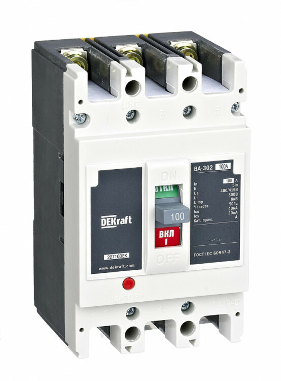 Автоматический выключатель в литом корпусе серии ВА-302L DEKraft; 3P; номинальный ток 40 А; откл. способность Icu = 25 kA (при 400 В пер.тока); уставка мгновенного срабатывания Ii = 5In. В комплект поставки входят 4 межфазные перегородки и крепеж на монтажной плате. Выключатели имеют компактный размер (на 10-15% меньше по сравнению с аналогами), что экономит место в распределительном щите. Уставка срабатывания 5хIn обеспечивает чувствительность к токам КЗ в конце линий большой длины.