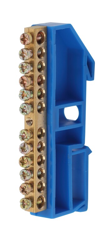 Шины латунные N «нейтраль» 6×9 на DIN-изоляторе применяются для электрического и механического соединения нулевых, защитных и фазных проводников в электрических щитах и распределительных устройствах. Изделия выполняются из латуни соответствующего сечения с отверстиями, обладающими винтовыми зажимами для подключения проводников. Шины установлены на пластиковый изолятор, изготовленный из полипропилена с добавлением антипиренов. Конструкция изолятора обладает креплением для установки на DIN-рейку. Цвет изолятора (синий/жёлтый) позволяет быстро и правильно идентифицировать тип подключаемого проводника.