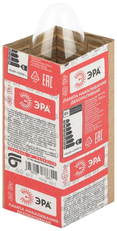Лампочка ЭРА B36 40Вт Е14 / E14 230В свечка прозрачная в гофре (кр. 100шт)